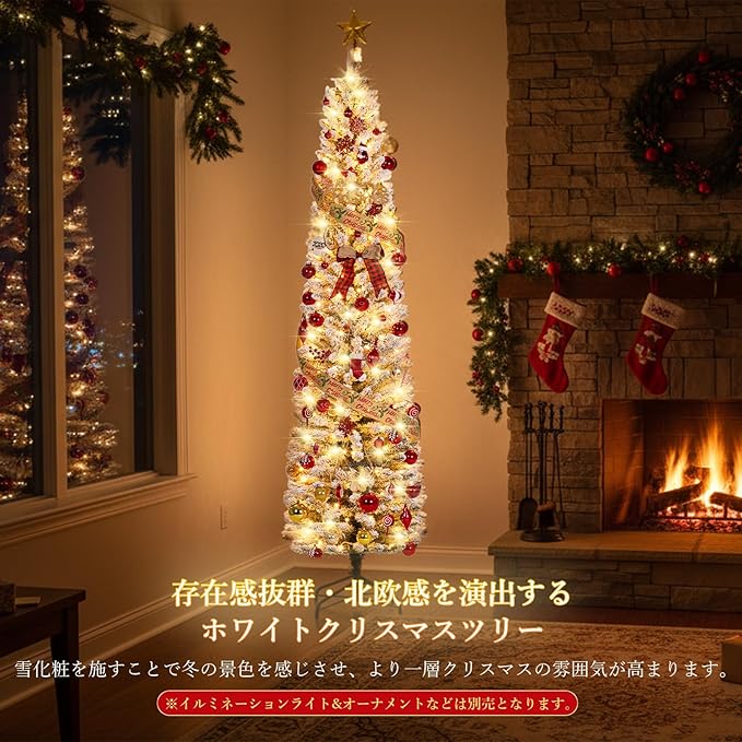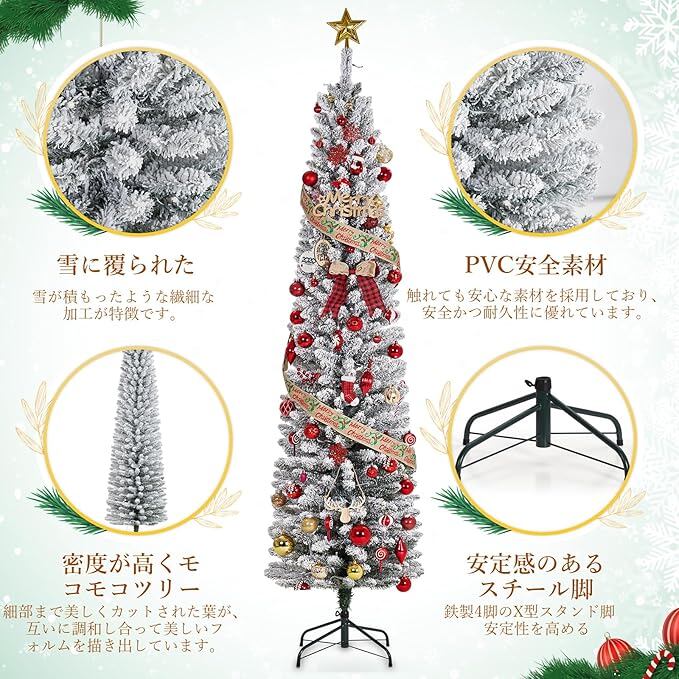【省スペース設計】細身の鉛筆型デザインで、床面積を大幅に節約できます。限られたスペースや狭い場所でも、クリスマスの雰囲気を手軽に演出できます!(高さ120cm)