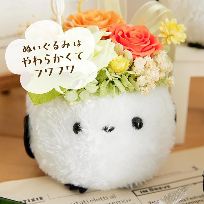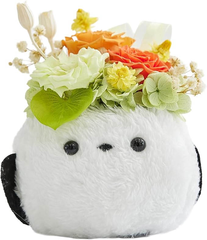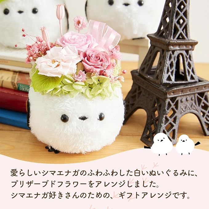 デザイン: 愛らしい白いシマエナガのぬいぐるみをベースに、バラ3種類とアンティークかすみそう、スターフラワーブロッサム、クリスパム、あじさい、ハートリーフ、リボン、パールで華やかにアレンジ