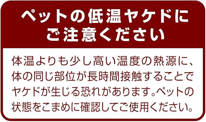 取扱説明書参照●本品はペット用です。ペット以外には使用しないでください。●本品は室内用です。屋外では使用しないでください。●人やペットが破片等を誤飲しないように注意してください。万一、誤飲した場合は各医師に相談してください。●幼児・子供には絶対に使用させないでください。 ●空袋は幼児・子供・ペットが遊ばないように注意してください。 ●飼い主の目の届く範囲で使用してください。 ●使用前に破損箇所がないかを必ず確認してください。 ●破損した場合は、直ちに使用を中止してください。 ●本品は、ペットがかんだり引っかく等すると、破損します。 ●かみぐせのあるペットには使用しないでください。 ●衝撃を与えたり、物を落としたり、突起物等でキズをつけたりしないでください。 ●本品をタオルや布団等で包むと設定以上の温度になり、故障や火災の原因になるので注意してください。 ●本品は精密機器ですので、取扱いには十分注意してください。 ●電源プラグを抜く時は、電源コードを引っ張らないで電源プラグを持って抜いてください。 ●外出する時・使用していない時・本品を移動する時・お手入れをする時は必ず電源プラグをコンセントから抜いてください。 ●床面等が変形・変色の恐れがありますので、長時間同じ場所で使用しないでください。 ●火気や水気のそばでの使用や保管はしないでください。 ●幼児・子供・認知症の方・ペットのふれない所に保管してください。★ヒーター本体は異常を感知すると安全装置が作動して、再使用することができなくなります。 ★ペットの性格・性質等をご理解のうえ、お選びください。 ★商品の仕様は予告なく変更する場合があります。 ★廃棄する場合は、各自治体の指示に従ってください。 ★品質管理には万全を期しておりますが、お気づきの点がありましたらお客様相談室までお問合せください。
