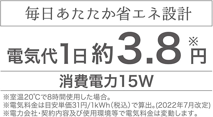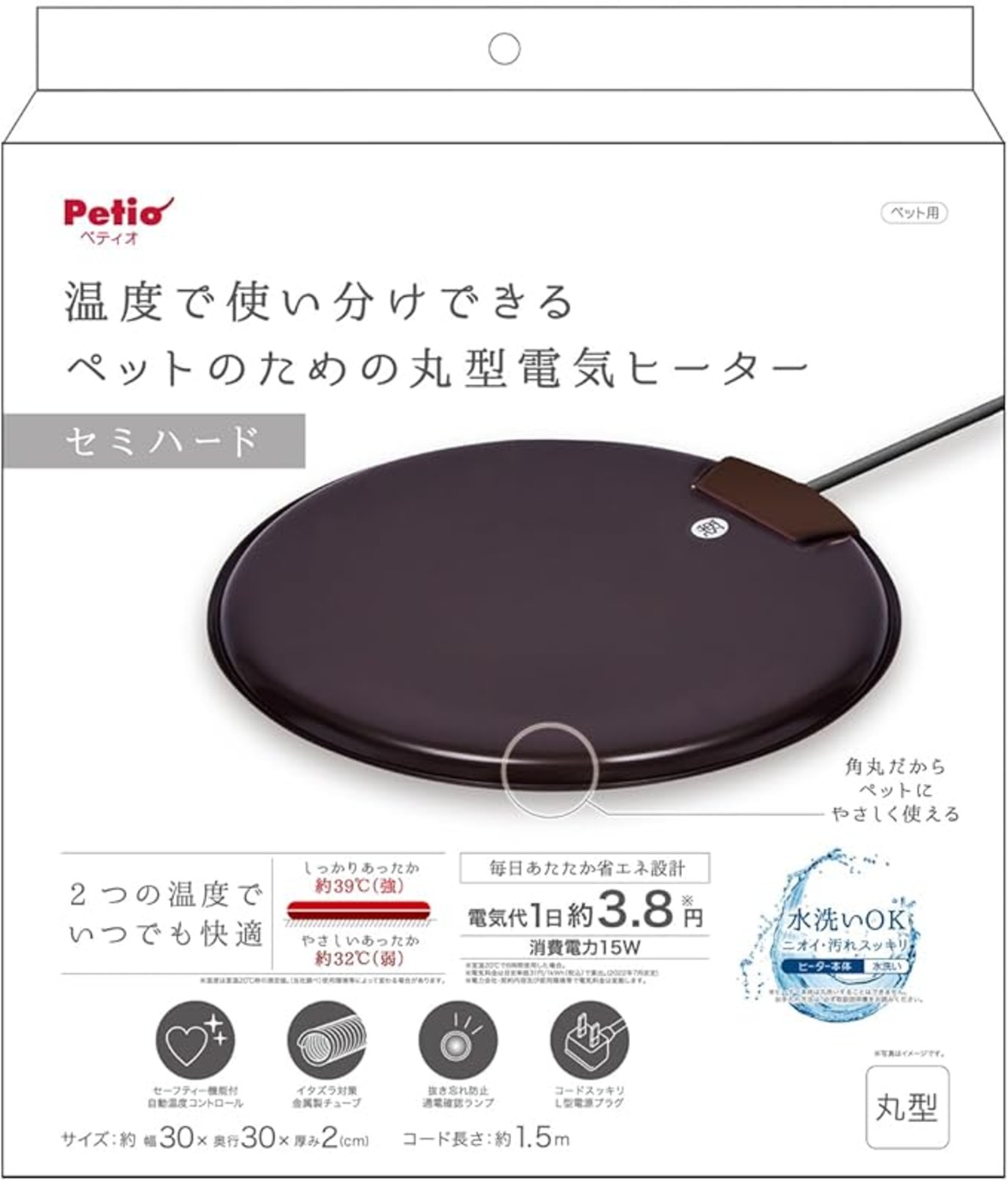2つの温度で使い分けできるソフトタイプの電気ヒーター。ペットにやさしく使える丸型形状。しっかりあったか高温面(約39℃)とやさしいあったか低温面(約32℃)でいつでも快適※室温20℃時の測定値。毎日あたたか省エネ設計。水洗いOKだからニオイ・汚れスッキリ※お手入れ方法は必ず取扱説明書をお読みください。セーフティー機能付自動温度コントロール仕様。イタズラ対策に金属製チューブを採用。通電確認ランプ付で抜き忘れ防止。L型電源プラグでコードがスッキリ、断線・破損の危険性を軽減する。※ペットに適した温度設定でゆっくり暖まるヒーターです。※ペットの低温ヤケドにご注意ください。
