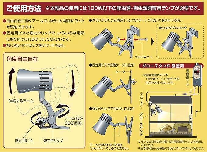 ・アームがゆるくなった時はマイナスドライバーでしめてください ・ランプは別売の爬虫類・両生類飼育用ランプを使用してください ・生き物が熱さから移動できるようにレイアウトしてください