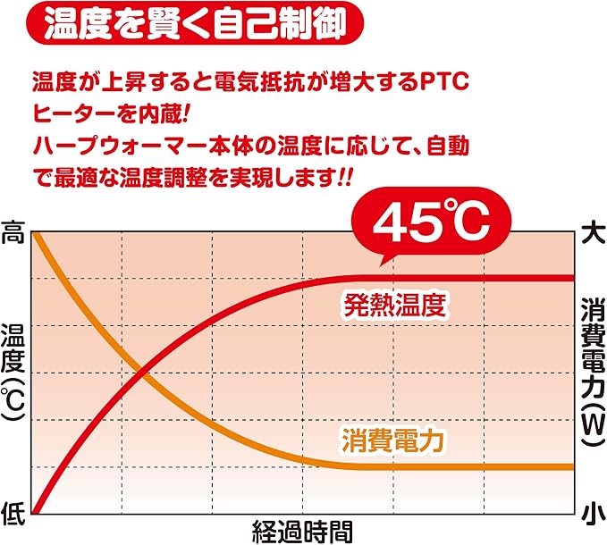 【自己制御機能】約45℃に表面温度を維持するため、過熱の心配がなく、安定した温度管理ができます。