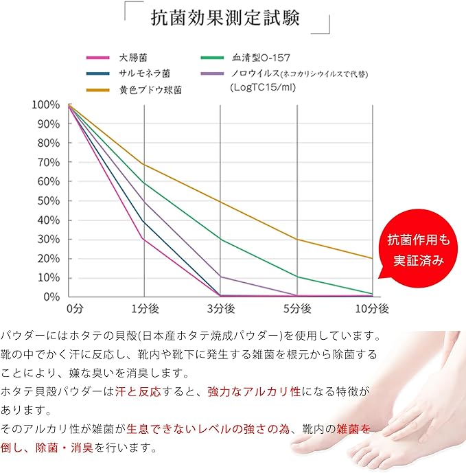 【匂いの原因である汗やむれに反応】 汗・皮脂・垢など足の雑菌が増殖することで独特な臭さが発生してしまいます。発生した匂いと足裏の汗にパウダーが反応し、5~10分ほどで靴内や靴下の菌を根本から除菌・消臭する力を発揮します(個人差があります)。また使用することで、①靴の中に雑菌が居なくなる②靴下等から足の指の間や爪の間等に入り、そこの雑菌も倒すため臭い原因を防ぐことも可能です。