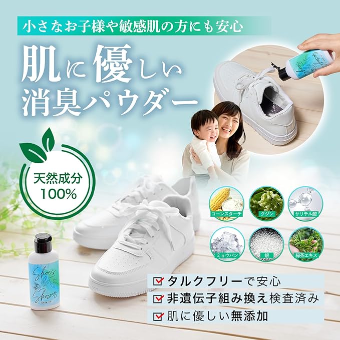 【安全・天然成分100%】:タルクフリーで、遺伝子を組み替えていないコーンスターチを使用し安全な天然成分のみを使用。肌に優しく、子供や敏感肌の方も安心してご利用いただけます。