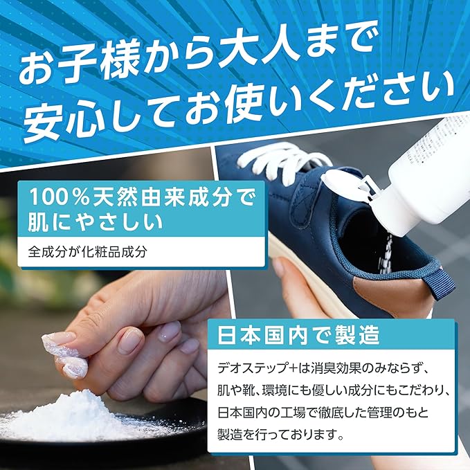 【安全・天然成分100%】 靴の匂いが気になる方に最適な足の匂い消し消臭粉は、天然由来成分を使用し、お子様から大人まで安心して使えます。また、デリケートな肌にも優しく、足元をしっかり保湿。靴の消臭や足の匂い消しに効果的で、スプレータイプではなく粉タイプなので、使いやすさも抜群。さらに、シューズパウダー 日本製の高品質な製造管理のもと作られており、家族全員で毎日お使いいただけます。