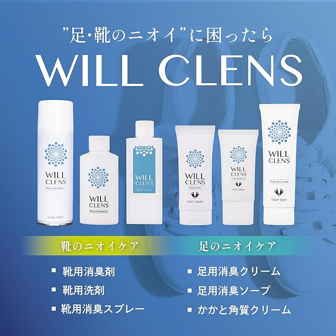 「靴のニオイが気になるけど洗えない」「家族の靴箱がなんだか臭う…」そんなお悩みに! WILL CLENS 靴用消臭スプレーは、シュッとするだけでニオイを瞬時にリセット。消臭力・除菌力・除湿力を兼ね備えた靴専用スプレーです。 【選ばれる6つの理由】 1、99.9%※ニオイを徹底消臭!気になる靴のニオイをしっかり除去。消臭試験でも高い効果を実証済み。 2、天然成分で安心ケア[茶カテキン]強力な消臭成分で靴の奥からスッキリ[ 銀イオン(Ag+)]菌の繁殖を抑え、清潔な状態をキープ[ 無香料タイプ]香りでごまかさず、根本からニオイを断つ 3、速乾性&さらさら仕上げ 微粒子ミスト さらさらパウダー配合。蒸れた靴も瞬時に快適!履いた直後のケアにも◎ 4、[逆さ噴射もOK!どこでも届く!]ブーツの奥や革靴のつま先など、手が届きにくい場所にもラクラク消臭。 5、[どんな素材の靴にも使える] スニーカー、パンプス、革靴、ブーツ、子供靴など幅広く対応。靴下や靴箱にも使用可能。 6、[他の消臭方法と比べても圧倒的に手軽で高機能] 比較表でも示される通り、パウダー・洗剤・活性炭と比べて消臭力・除菌・除湿のすべてにおいて優秀。 【使用シーンいろいろ】・毎日履く靴のケアに・家族みんなで使える玄関・靴箱用に・ニオイが染みついた靴下にも・洗いにくい革製品やブーツに・使い方は簡単、靴の内側にシュッとスプレーするだけ!毎日のケア習慣に。 【こんな方におすすめ】・靴のニオイで毎日ストレスを感じている方・家族や来客に玄関のニオイを気づかれたくない方 ・洗えない靴をどうにかしたい方・お子様の成長期の靴や運動靴のニオイが気になる方