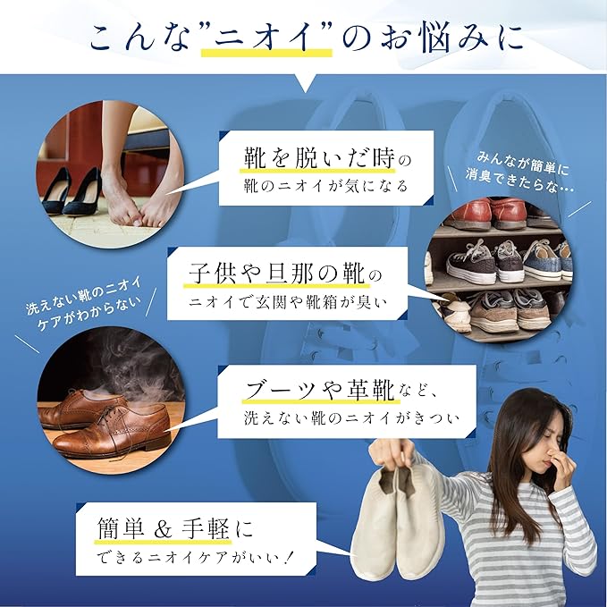 【こんな方におすすめ】・靴のニオイで毎日ストレスを感じている方・家族や来客に玄関のニオイを気づかれたくない方 ・洗えない靴をどうにかしたい方・お子様の成長期の靴や運動靴のニオイが気になる方