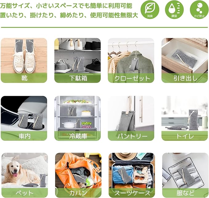 【漏れや着色防止】不織布と麻生地の二重加工袋で包装され、竹炭の劣化粉砕による漏れや着色を避けます。無地かつシンプルなデザインで、使用場所の清潔さをキープしてくれます。また、天日干しをすれば吸収力が回復し、最大二年間繰り返してご使用いただけます。更に、使い終わったら土に撒き、植物の成長を促進して土壌改善効果も期待できます。