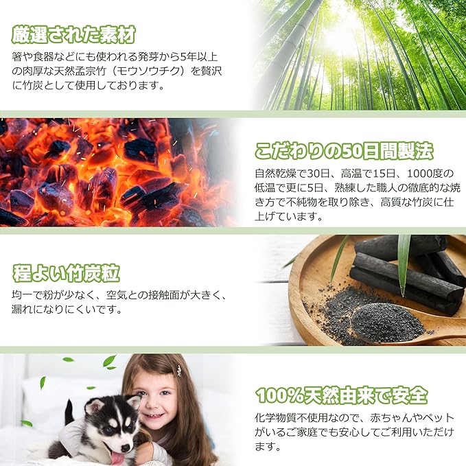 【こだわりの作り】100%天然孟宗竹より作られ、化学物質などを含まず、赤ちゃんやペットのいる家庭でも安心してご利用いただけます。また、ISO国際認証済みの工場でこだわりの50日間製法によって生産し、高質な竹炭バッグに仕上げています。