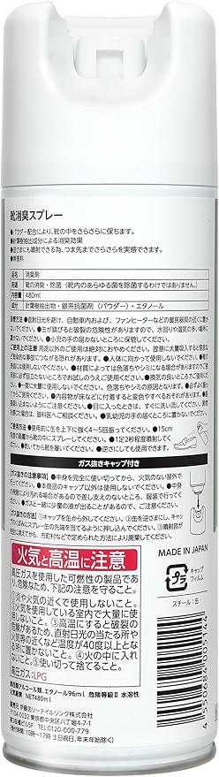 保管方法 ●直射日光を避け、自動車内および、ファンヒーターなどの暖房器具の近くに置かないでください。●缶が錆びると破裂の危険性がありますので、水回りや湿気の多い場所に置かないでください。●小児の手の届かないところに保管してください。 ご使用上の注意 ●用途以外のご使用は絶対におやめください。故意に大量吸入すると窒息など致命的な事故につながる恐れがあります。●人体に向かって使用しないでください。●靴の表面には使用しないでください。●材質によっては色落ちやシミになる場合がありますのでご使用前に必ず目立たないところでお試しのうえご使用ください。●換気の良いところでご使用ください。●一度に大量に使用しないでください。色落ちやシミの原因となります。●必ずよく振ってからご使用ください。●内容物が床などに付着すると変色やすべるおそれがあります。●直接吸い込まないようにご注意ください。●目に入ったときは、すぐに洗い流してください。異常を感じた場合は、眼科医へご相談ください。●乳幼児の手の届くところに置かないでください。 ご使用方法 ●使用前に缶を上下に強く4~5回振ってください。●15cm程度の距離から靴の中にスプレーしてください。●1足2秒程度噴射してください。●乾いてから靴を履いてください。●逆さにしても使用できます。 原材料・成分 針葉樹抽出物、銀系抗菌剤(パウダー)、エタノール 続きを見る