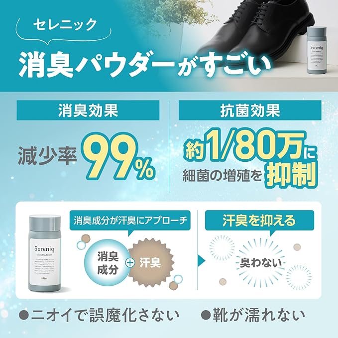 ✅【”ふりかけ”タイプの靴消臭パウダー】セレニックの靴消臭パウダーは、天然成分配合・タルクフリー・日本製の靴にも足にも優しい靴用消臭剤です。さらに、靴にふりかけるタイプのため、粉が舞いにくく、使う場所を選ばず簡単にお使いいただけます。