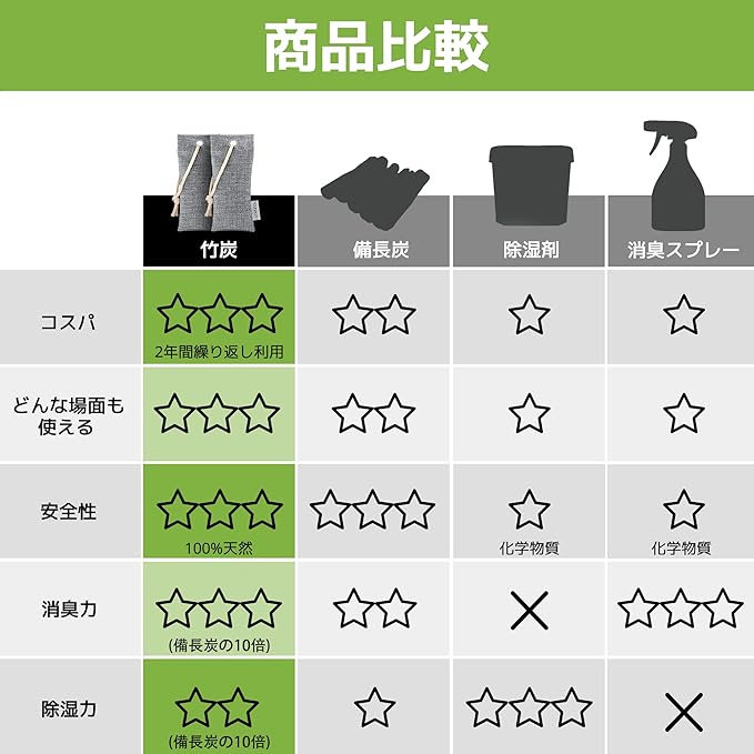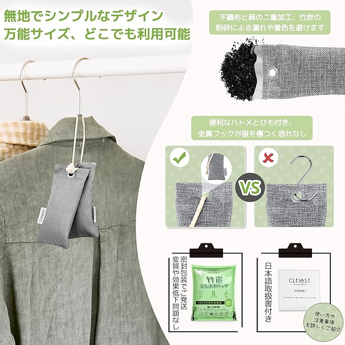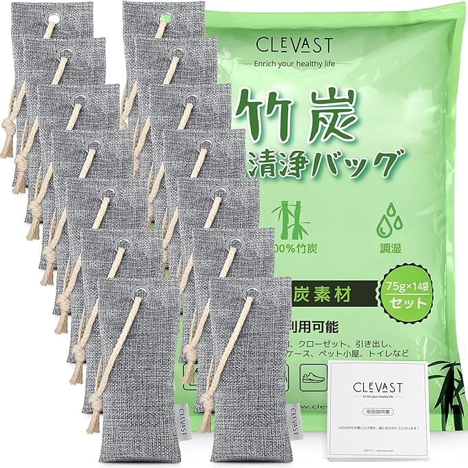 【幅広く活用】CLEVASTの竹炭は木炭や備長炭などより10倍以上の消臭と除湿力を持ち、消臭剤や乾燥剤、除湿剤として活用できます。部屋、玄関、車内、トイレ、冷蔵庫、革靴、ブーツ、下駄箱、クローゼット、パントリーなどの湿気と匂い対策としてぴったりです。