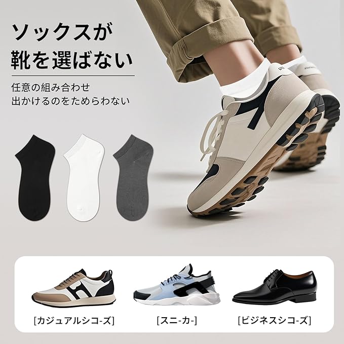 【即効消臭|脱いでも気にならない快適さ】 学生・ビジネスマンに最適。独自の消臭成分が足のニオイを素早く中和。靴を脱ぐ授業・会議・接待の場でも安心の消臭効果。厚すぎない軽量設計で蒸れを軽減し、1日中快適に履き続けられます。