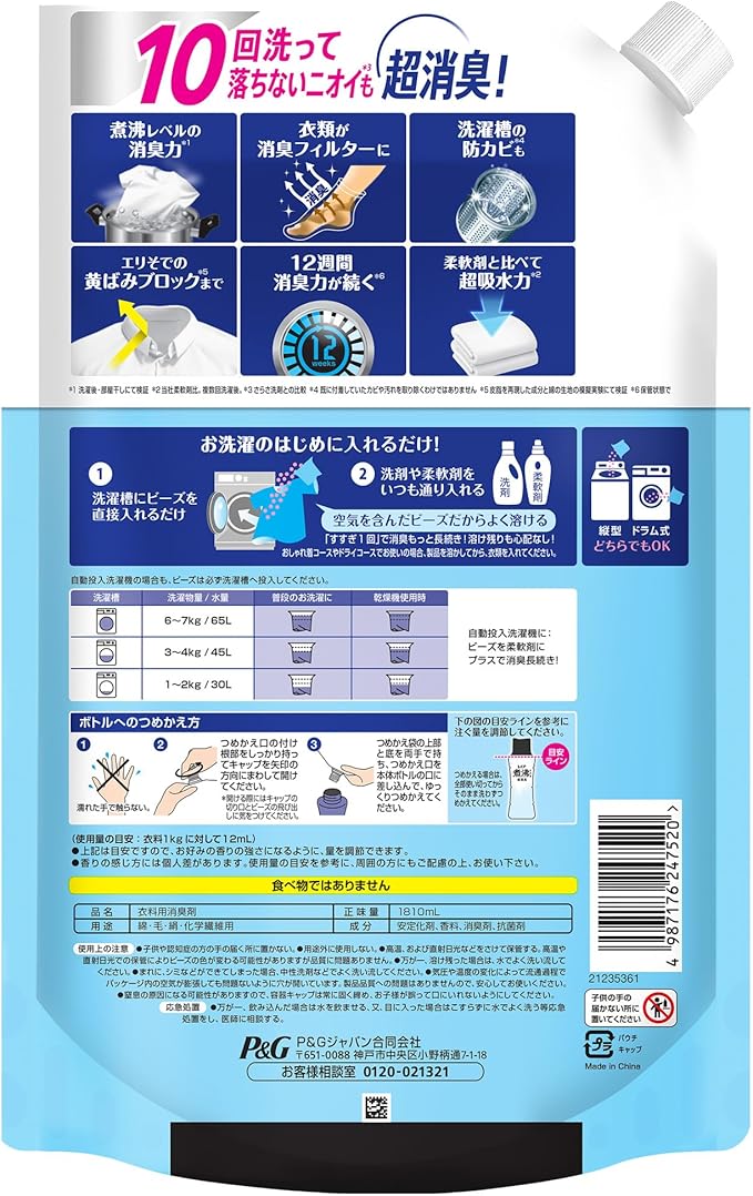 レノア 超消臭 煮沸レベル消臭 抗菌ビーズ 消臭+防カビ クリーンフレッシュ