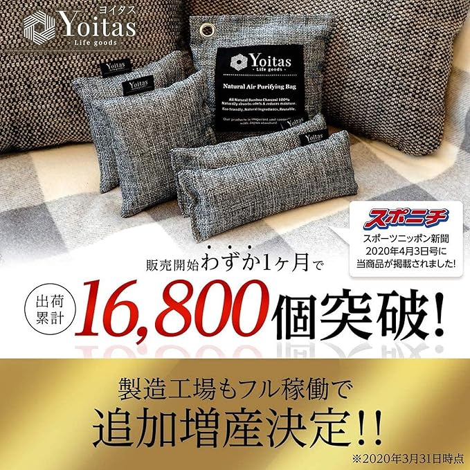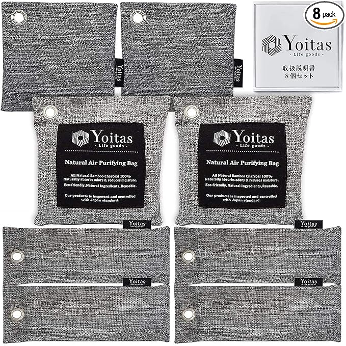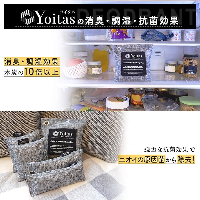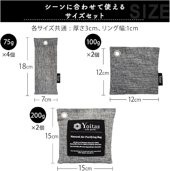 Yoitas(ヨイタス)竹炭 消臭 除湿 パック 8個セット 内容(200g 2個、100g 2個、75g 4個、取扱説明書) 大人靴~子供靴まで使える75gパックや除湿器などが入らないスペースにも使える100gと200gがセットになったお得なセットです。