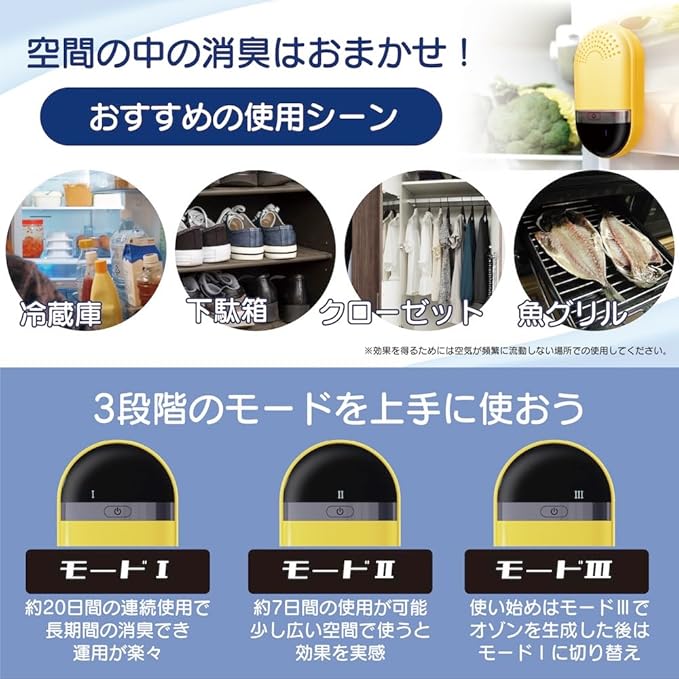 ✅ [3つのレベルモードで消臭!] モード【Ⅰ / ⅠⅠ / ⅠⅠⅠ】の3つのモードでオゾンの生成量を調整できます。 モード Ⅰ(スタンダード):【1分間オゾンの生成⇄139分のOFF】を約20日間繰り返します。 モード ⅠⅠ(クイック):【4分間オゾンの生成⇄66分のOFF】を約7日間繰り返します。 モード ⅠⅠⅠ(ファスト):【5分間オゾンの生成⇄30分のOFF】を約3日間繰り返します。