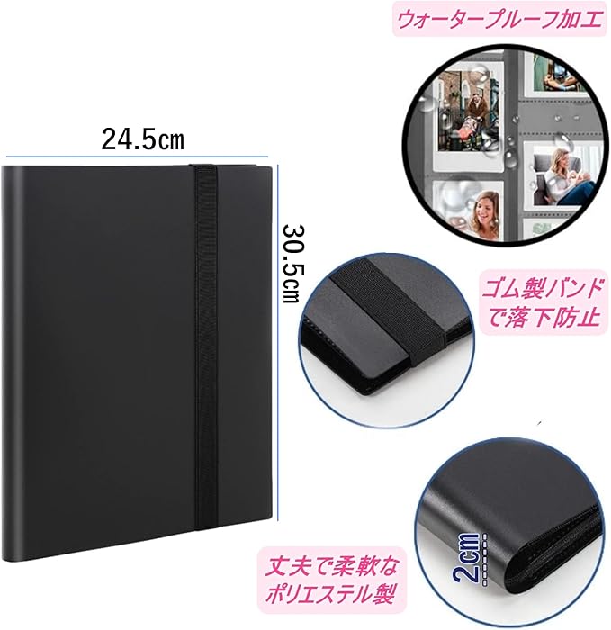 中のフィルムは耐久性に優れ、透明度の高いポリプロピレンを採用しており、ほこりや汚れから思い出のチェキやポラロイド写真を守ります。
