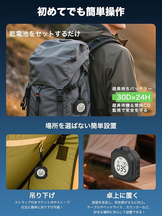 【3in1高性能COチェッカー・アウトドア安全設計】2025年進化モデル。一酸化炭素チェッカーは一酸化炭素濃度・温度・湿度を同時に高精度測定できる3in1仕様。アウトドア環境特化チューニングにより、湿気・冷気・結露が多い日本のキャンプシーンでも安定稼働。※本製品を室内用の一酸化炭素警報機ではございません。