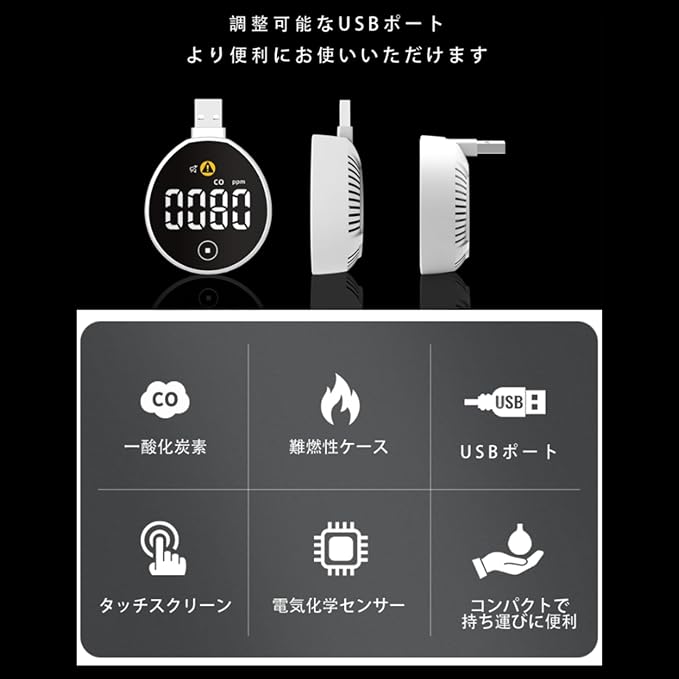 USB充電式 警報機ポータブル長寿命 一酸化炭素チェッカー85db大音量 車中泊・キャンプ・アウトドア対応 耐久性小型携帯用 光・音・振動アラーム 日本語説明書付き 高精度デジタル表示 5V-1A給電 車中泊ストーブ対策 3段階警報システム アウトドア必須アイテム 防水防塵 センサー寿命5年 コンパクト軽量 非常用LEDライト付き ワンタッチ操作 温度補正機能 自動校正 | etshop