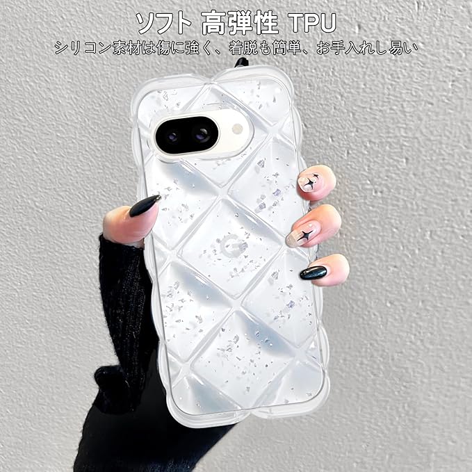 ♥【Google Pixe 9A対応】このPixe 9Aクリアケースは透明TPUとウェーブエッジ、背面ダイヤモンドひし形ふわふわとアルミ箔シルバーキラキラ装飾で作られており、光の下でダイヤモンドのように輝き、高級感を醸し出します。