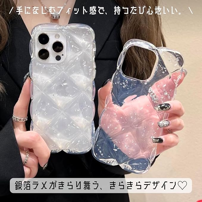 【今流行りのキルティングデザイン】 うねうねとしたエッジとダイヤ柄のひし形凸凹加工、アルミ箔シルバーの装飾を施した、大人可愛いiPhone用クリアケースです。シンプルながらもゴージャスな雰囲気を演出します。