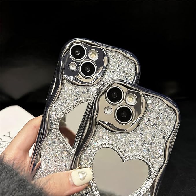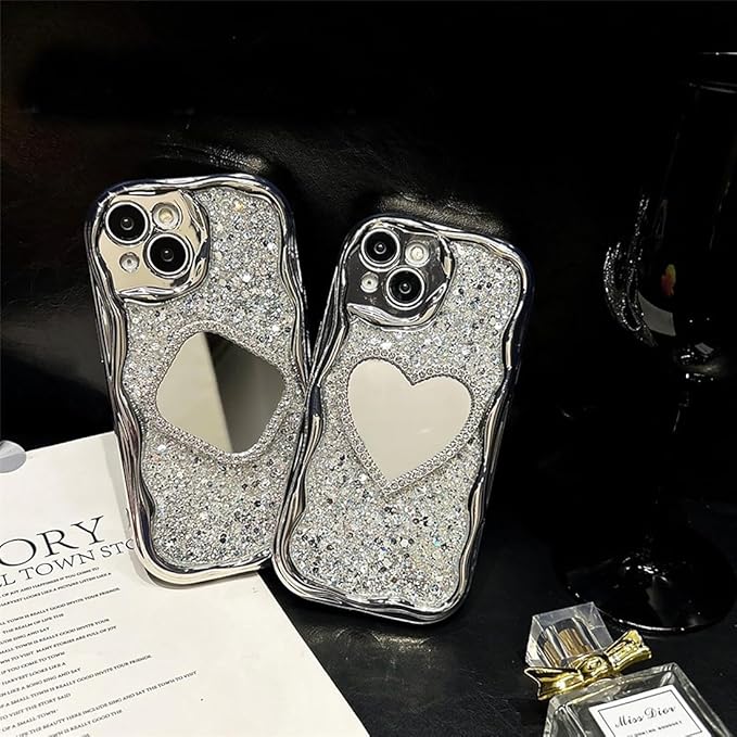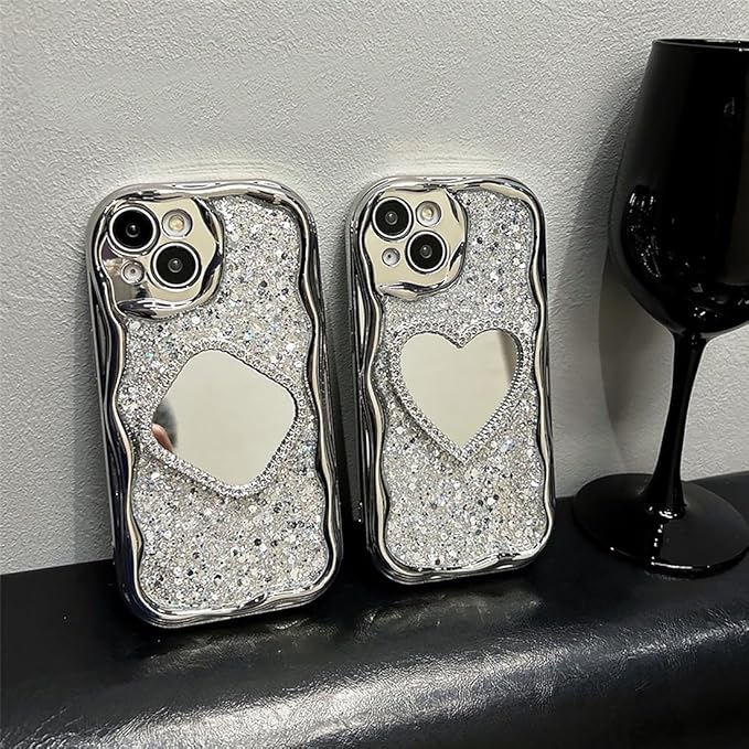 【ウェーブ型】キラキラケースにハート型の鏡がデザインされています。流行りのウェーブのようなうねうねフレームアイフォンケース。