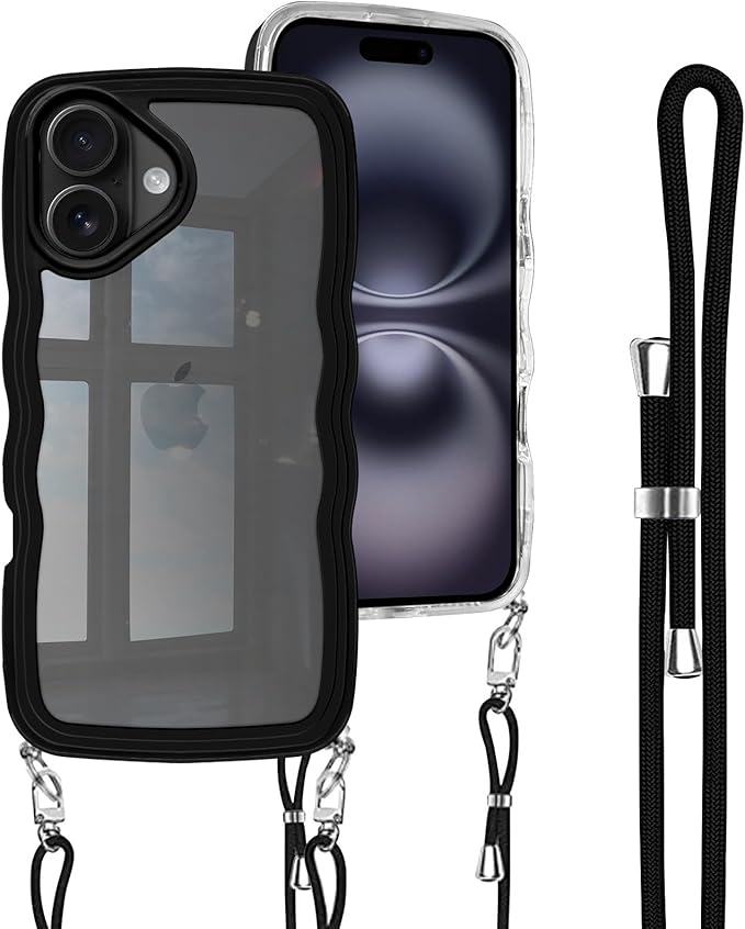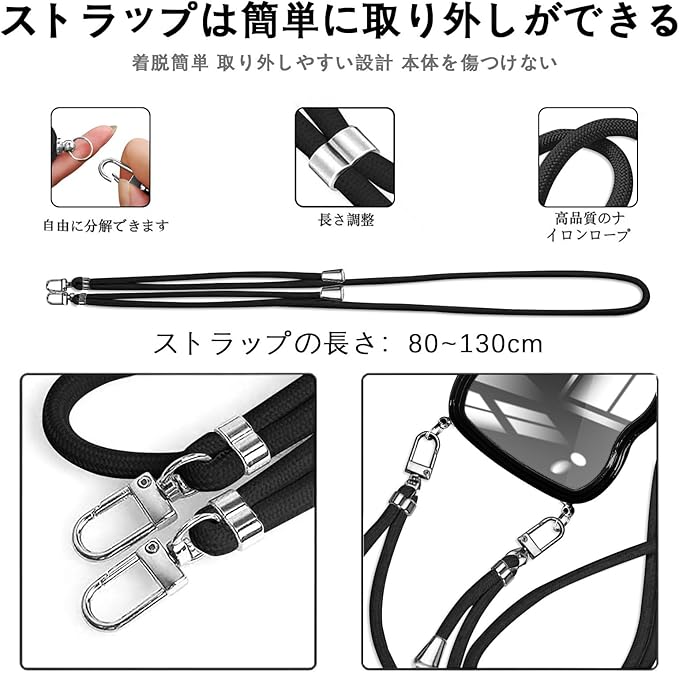 iPhone 16 用 ケース クリア ショルダー iPhone16 用 カバー 首掛け 肩がけ 斜めかけ 紐付き ストラップ付き アイフォン16 用 ケース 韓国 可愛い かわいい 透明 薄型 シリコン TPU バンパー スマホケース ブラック | etshop