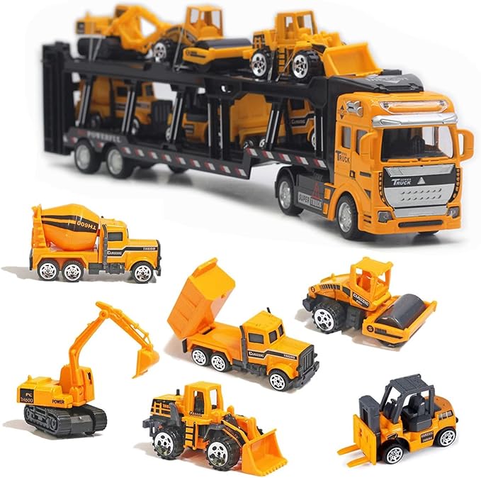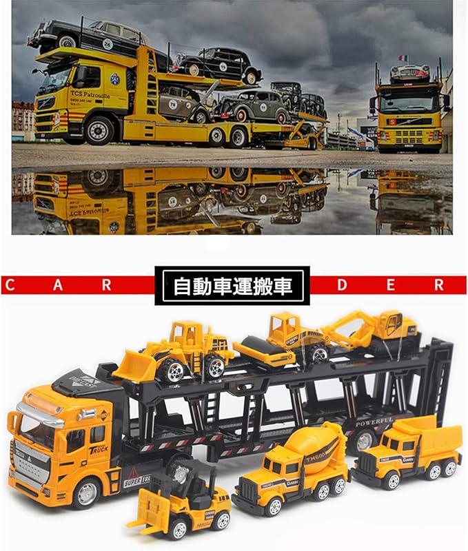 【新型自動車運搬車セット】自動車運搬車X1、ミニカーセットX6 リアルに再現された建設作業車で、お子様に各車両の種類を認識させ、好奇心を刺激するだけではなく本物のエンジニアリングシーンを復元することでお子様の認知を育てます。工事現場のごっこ遊びをしているうちに、お子様は頭中に場面を想像しながら、現場作業を真似します。