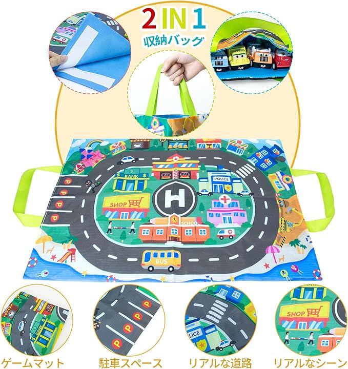 【2IN1カーマット】収納バッグにも、プレイマットにもなります。地図や情景部品も付いていて、柔らかい不織布でできています。12台の車おもちゃをセットして、子供が車を遊ぶとき、収納バッグを広げて、車のゲームマットになります。