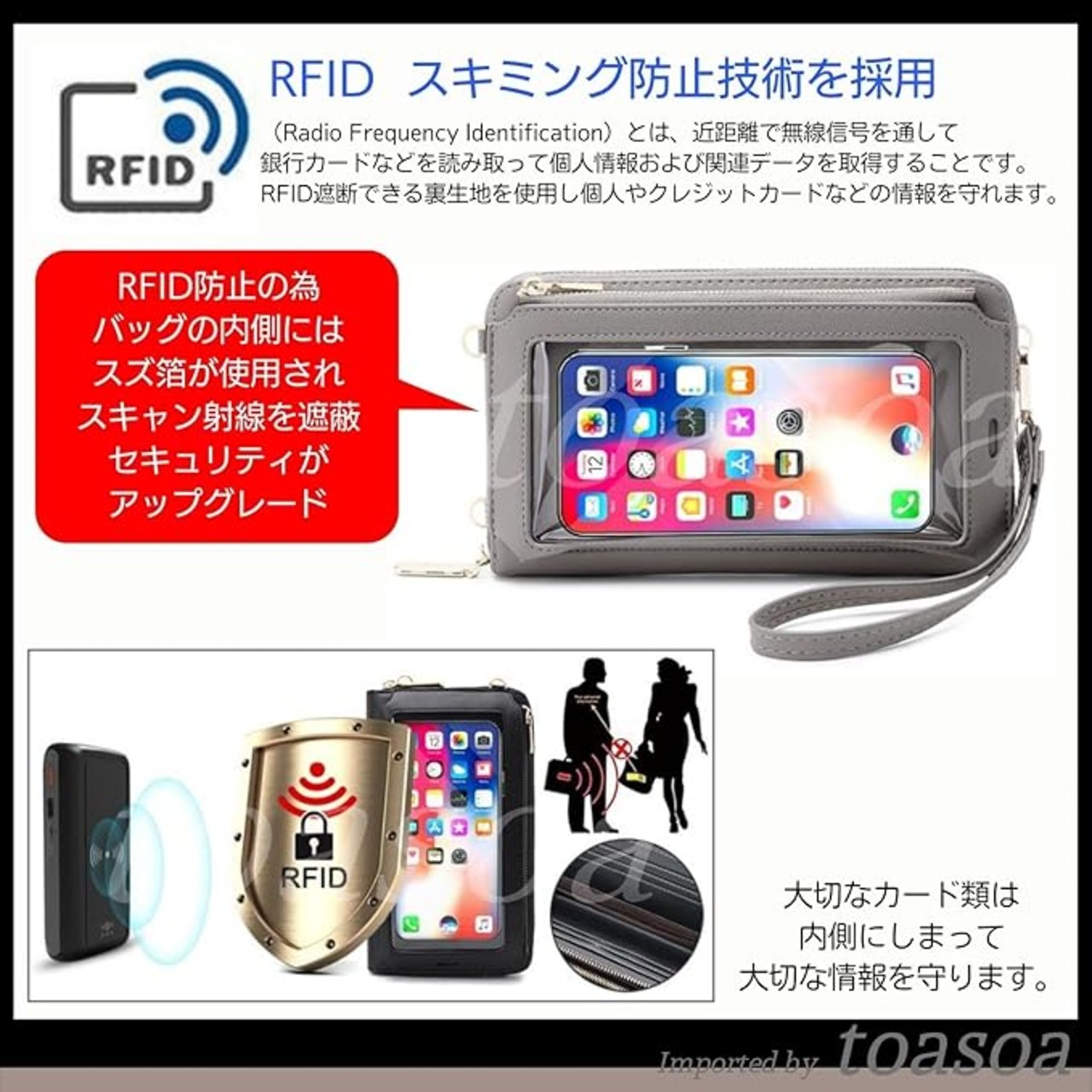 タッチパネルに対応でスマートフォンを入れたまま操作可能なマルチ収納ポーチ。お財布機能も兼ね備えているのでこれ一つでちょっとしたお出掛けやトラベルバッグとしてもお勧め。縦型と横型で気分で使い分けが可能となっています。たっぷり収納、ファスナー付き小銭入れも付いています。スマホを入れたまま充電できます。