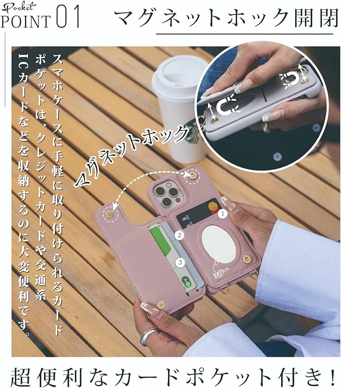 【カード収納・鏡付き】キャッシュレス化が進む現在、お出かけ時にカード収納・鏡付きができ身軽になれる12/12pro ケースが大人気!本製品は背面カード入れ ケースが付き、ICカード、お札などを収納できる手帳型 ショルダー ケースです。●マグネットボタン付きで開け閉めがとても便利!カードポケットをしっかり止められ、カードが落ちる心配がありません。●ミラーも付き、メイク直し時や身だしなみのチェックに最適です。