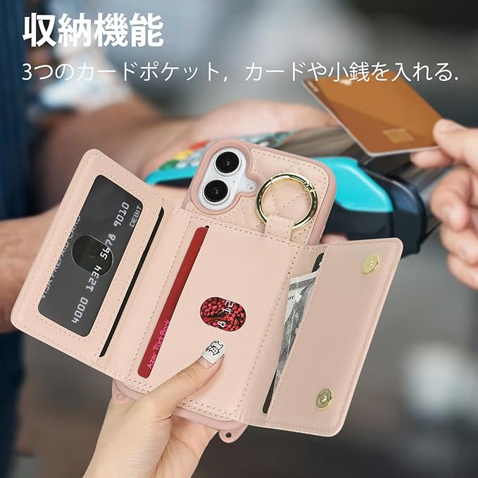 対応 iPhone 16 ケース ショルダー いphone16 ケース カード収納 鏡 肩掛け 斜めかけ スマホショルダー アイフォン16 ストラップ付き 耐衝撃 調節可能な 携帯ケース - ローズゴールド | etshop