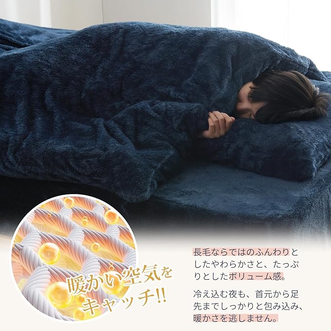 【長毛でしっかり保温】長い毛足が空気をたっぷり含み、体温を逃さずキープ。冷え込む夜も首元から足先までやさしく包み込み、朝まで続くあたたかさを実感できます。