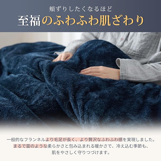 【贅沢なロング毛足の肌ざわり】毛足が長く、とろけるようなやわらかさ。軽やかに体を包み込み、掛けても重さを感じにくく、贅沢な心地よさをお楽しみいただけます。