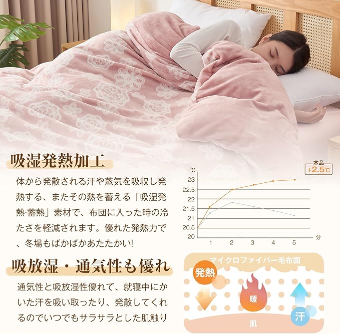 【吸湿保温&抗菌防臭加工掛け布団カバー 】吸湿発熱素材を使用し、身体から出る湿度を利用して熱に変換、自ら暖かくなり、暖かさを実感できます。特殊な技術で保湿成分を繊維に練りこむことにより 、生地の水分率を保て、肌にうるおいを与えてくれます。細菌の増殖を抑制し、嫌なニオイの発生を抑えるので、いつも気持ち良くご使用頂けます。小さなお子様のいるご家庭でも安心して使えます。