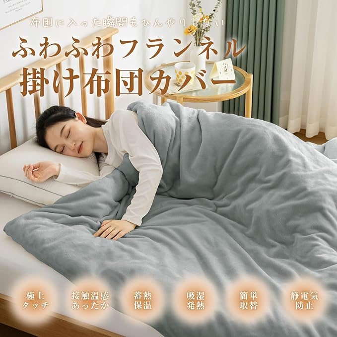 【あったか接触温感フランネル掛け布団カバー 】寒い季節に「肌に寄り添う温もり」をお届けする、高級のフランネル製布団カバーです。 その秘密は、厳選された超極細繊維の構造にあります。この繊維は一本一本が極めて細く、且つ柔らかいため、肌に接触した瞬間に「あったかさ」を感じさせるだけでなく、繊維間に無数の微細な空間を作り出します。この空気層が優れた保温効果を発揮し、冷え込みが気になる季節も、じんわりと温かな睡眠空間を保ちます。 この肌触りと保温性をぜひ、お手持ちの掛け布団カバーとしてご体感ください。当社の掛け布団カバーは、この特殊なフランネル生地を使用しており、従来の綿製カバーとはひと味もふた味も違う、心地よさを実現しました。 寒い朝が憂鬱な方、より快適な睡眠をお求めの方へ。この極上のフランネルの掛け布団カバーが、あなたの毎日の安らぎを温かく包み込みます。
