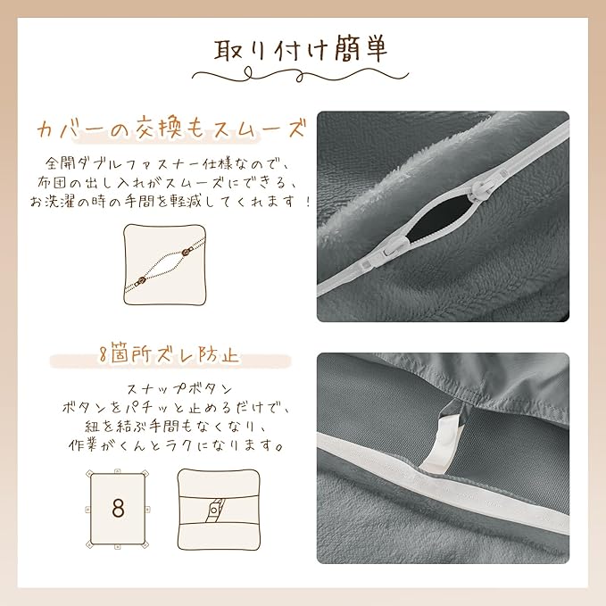 【商品情報】フランネル掛け布団カバーサイズ:シングル・150x210cm;表地裏地:極細フランネル生地(高密度220g/m ) ※仕様:ダブル片側全開ファスナー使用、お布団の出し入れが便利・スナップボタン8ヶ所付きで、布団がズレにくく快適にご使用できます。