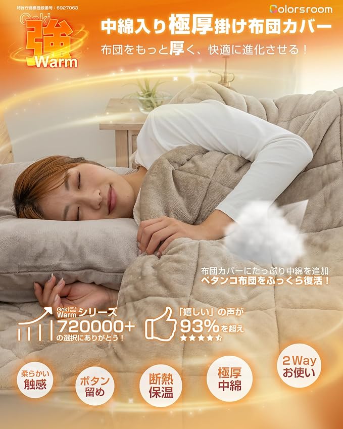 【中綿入り極厚掛け布団カバー】保温・蓄熱性に優れた中綿をたっぷり使用、厚みは通常のカバーの3倍以上、一般的な毛布の2倍以上、優れた保温力が実現できる。どんな布団でも、カバーをつけるだけでふっくら暖かくなります。