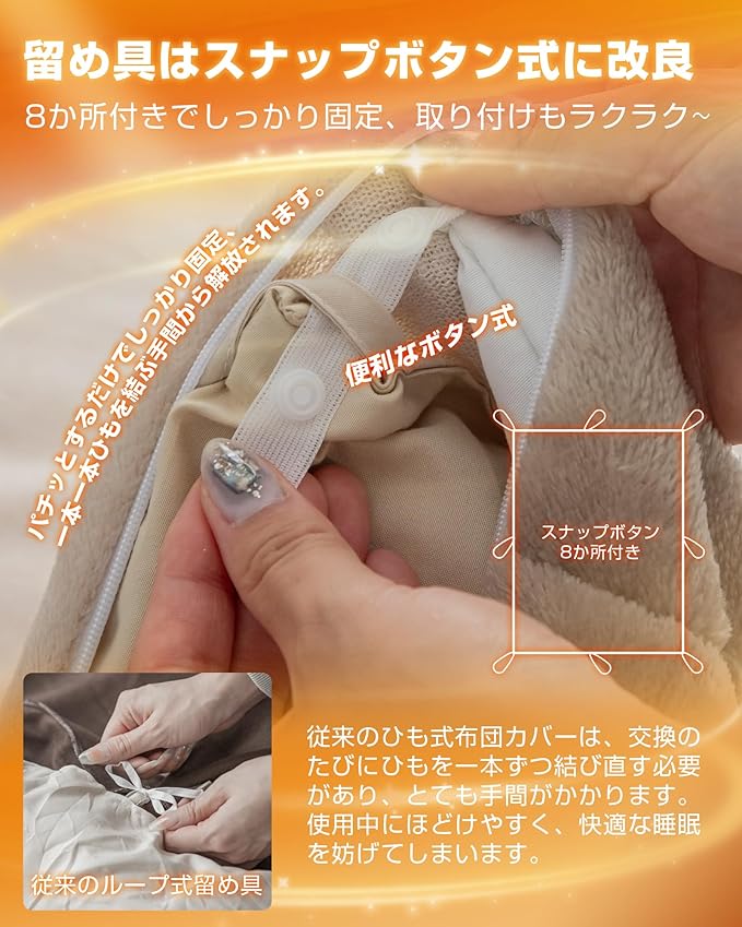 【全開ファスナー・スナップボタン式で便利】片側に全開ファスナーを採用し、着脱が簡単。さらに8箇所のスナップボタンで布団をしっかり固定するので、寝返りしてもズレや丸まりの心配がありません。ズレにくく着脱しやすい上、お手入れも簡単で、忙しい方にぴったりです。