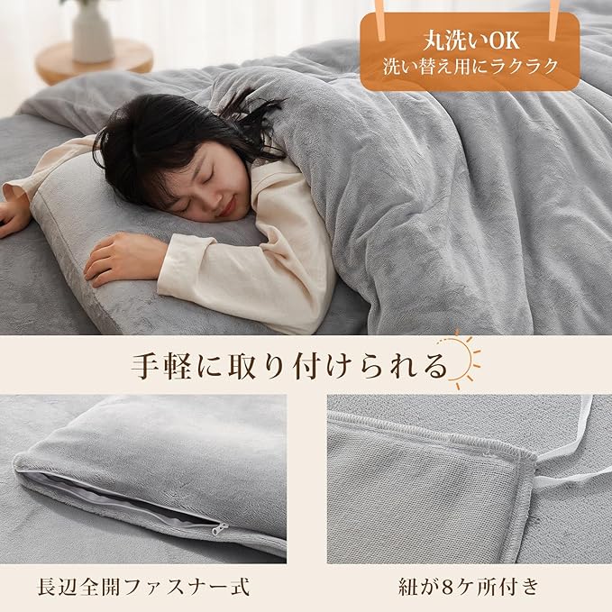【取付簡単】長辺210cm全開ファスナーあり、着脱が楽々で簡単です。布団留めひも8ヶ所付きなので、しっかり固定できて、夜中に寝相が悪くても大丈夫です。