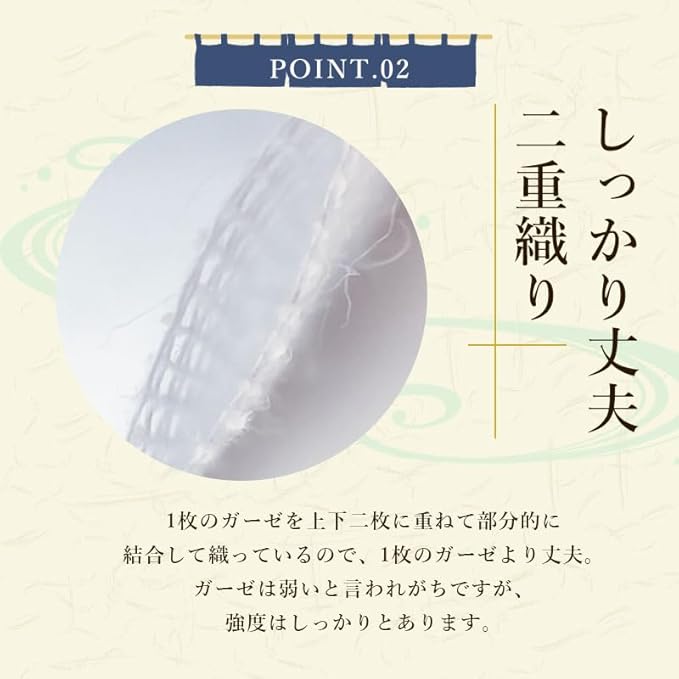【ガーゼ2重織り】1枚のガーゼを上下2枚に重ねて部分的に結合しました。弱い印象のがーぜですが、強度をアップしています。