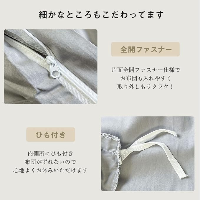 【仕様】:片側ファスナー使用,布団留めひも8ヶ所。素肌に触れるのに最適な100%コットン製サテン仕上げのふとんカバー。優しくふんわりとした肌ざわりに優れた通気性と柔軟性で、快適な睡眠求める方におすすめです。