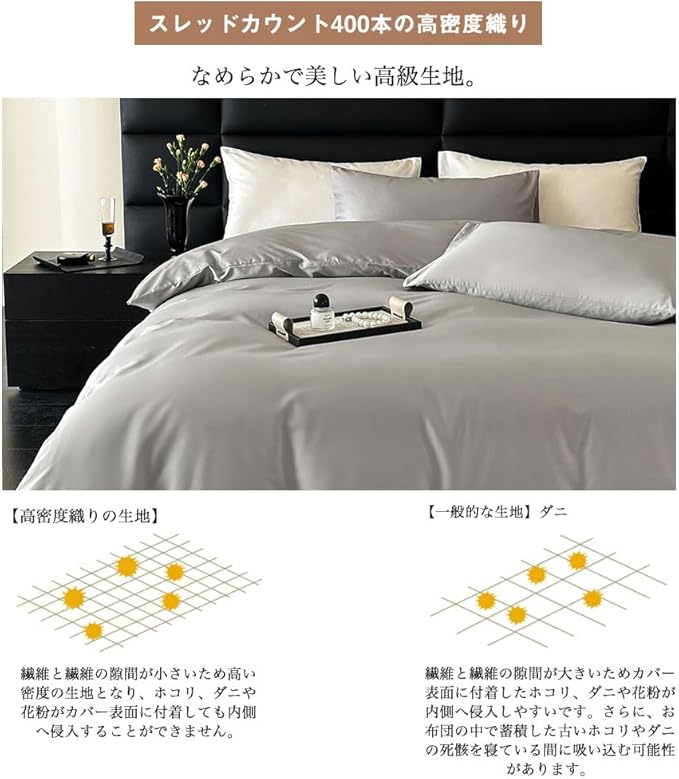 【掛け布団カバー シングルサイズ素材】:綿 100%。良質で高価な100番手双糸の超極細糸を使用し、打ち込み本数は400本です。シングルサイズ-150 210cm