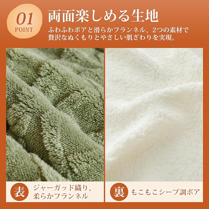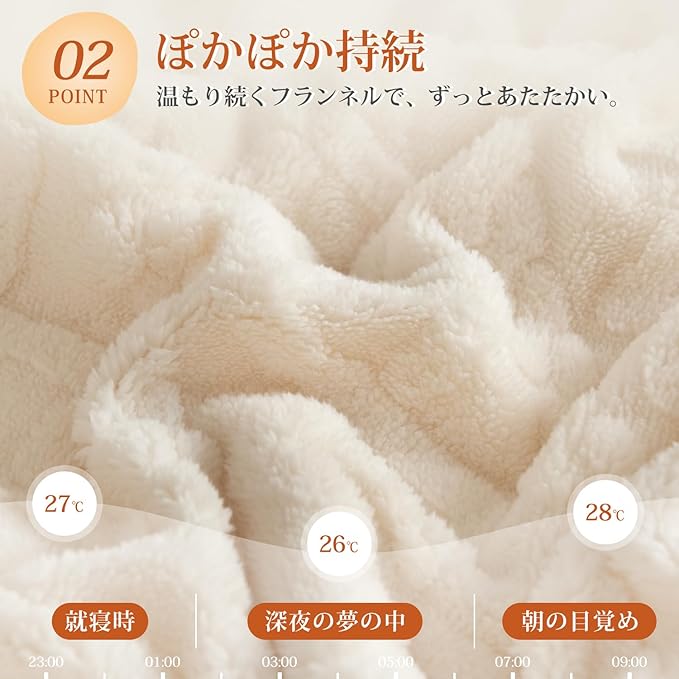 【贅沢二枚合わせで、極上のあたたかさ】柔らかいフランネルとシープ調ボアを二枚合わせにした贅沢仕様。空気をたっぷり含む構造で保温性が高く、寒い冬の夜も朝までぬくもりが続く。