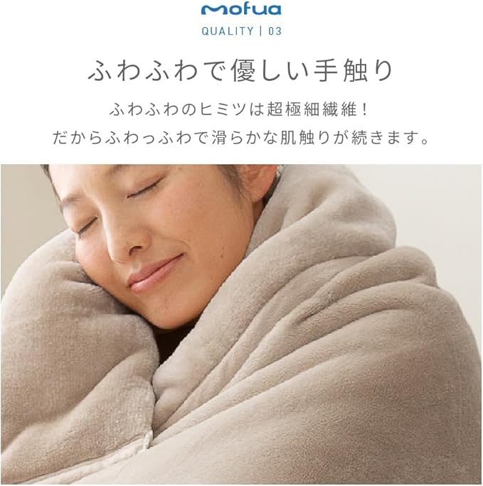 シルクよりも細い超極細繊維のプレミアムマイクロファイバーを高密度に編み上げたmofuaの格別のなめらかな肌ざわりが、質のいい睡眠を促します。朝、お布団から出られなくなるほど、気持ちよくあったかい4層毛布です。