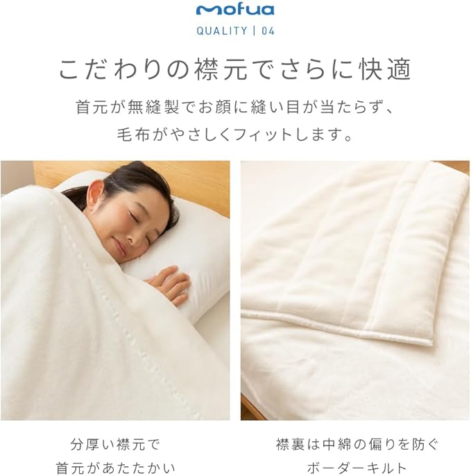 襟元にヘムがこないように2重に仕立てられた襟付き仕様の毛布なので、冷気が入り込みやすい首まわりも暖かく、直接お肌に触れる首元までmofuaの気持ちよさを堪能できます。