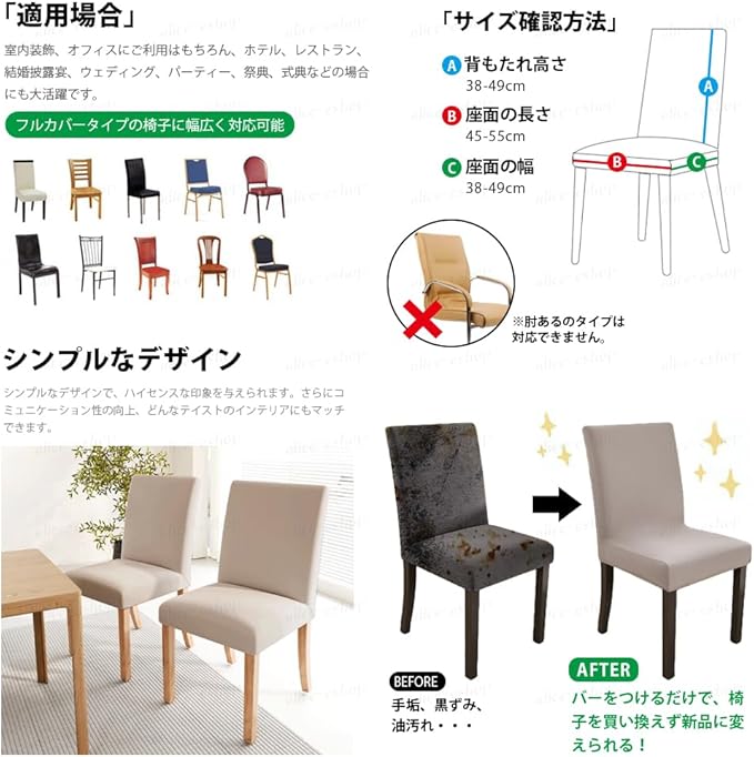 【活躍シーン】多彩な色で自分だけのインテリアを作って、ご家族と一緒に気軽にくつろげます。カラフルなカバーを使って古いイスでも完全に新品のように見えます。 椅子を買い換えずイスカバー1枚で新品の椅子に変えられます。捨てるのも惜しいご愛用のイスが真っ新なおしゃれなイスへと大変身。汚れてもすぐに洗えるウォッシャブルタイプだから安心。家庭だけではなく、パーティー、結婚式、披露宴などにも活躍できる!バーをつけるだけで、見慣れた家具の印象がガラッと変わります。
