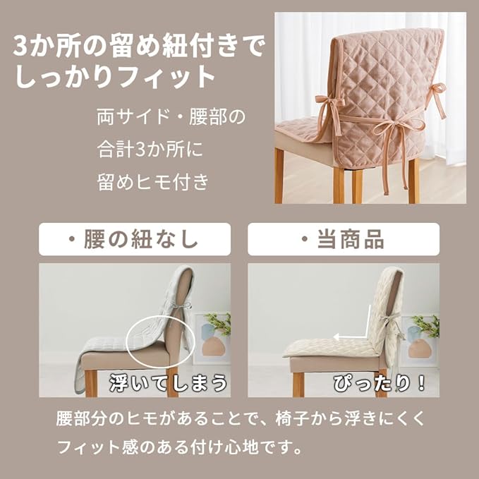 【装着しやすい。】チェアカバーを、被せてサイドと、腰の部分の紐を結ぶだけで簡単に装着出来ます。サイドの他に腰の部分にも紐があるので、椅子から浮きにくく、ぴったりフィットします。また、紐も切れにくいです。