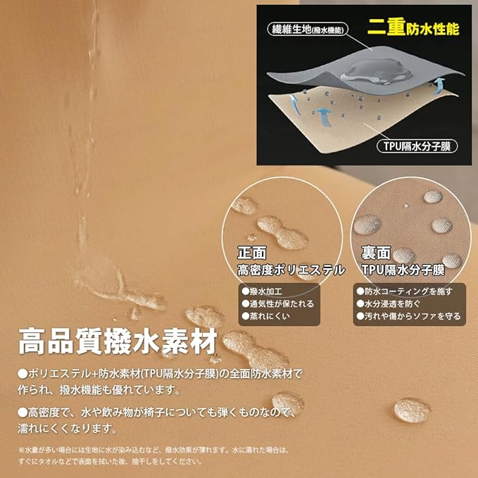 【全面防水素材】ポリエステル+防水素材(TPU隔水分子膜)の全面防水素材素材で作られ、高い耐久性を持ち、高密度で、水や飲み物が椅子についても弾くものなので、濡れにくくなります。優れたストレッチ性で、チェアにぴったりフィットします。一人でも簡単に取り付けます。座面までピッタリ!ブカブカしない!