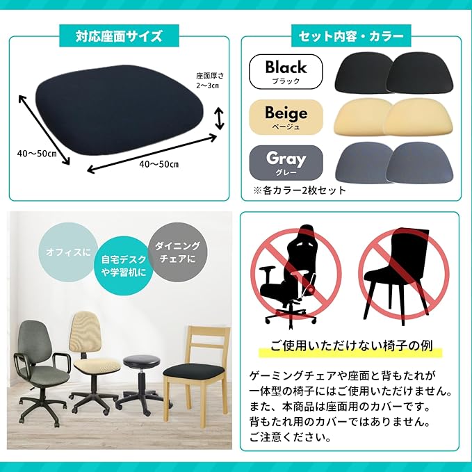 【幅広い対応サイズ】 座面サイズ:縦40〜50cm 横40〜50cm 厚さ2〜3cmに対応。 ※背もたれ一体型・ゲーミングチェアタイプには対応していません。